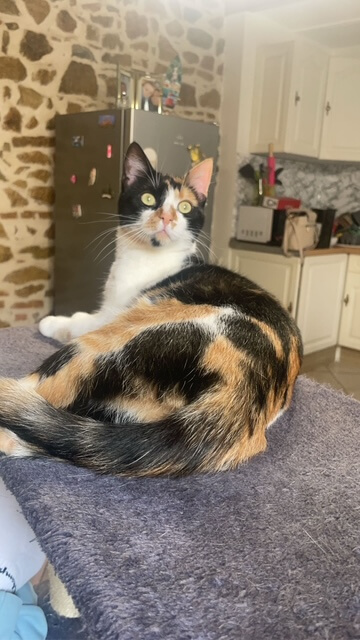 femelle depuis le 22 août 2025 à NERONDE. Elle est stérilisée et a une puce électronique. Un peu craintive.